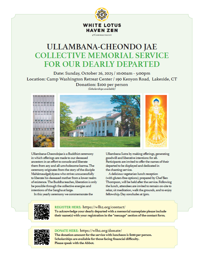 Participants are invited to offer the names of their departed to be displayed and recited in the liturgy. If you would like your dearly departed to be acknowledged in the service please email info@wlhz.org for more information and instruction, or include the names of your departed with your registration in the “message” section of the contact form. A symbolic nameplate burning rite, to eliminate unwholesome karmic conditions, will also be performed. A socially-distanced outdoor reception will be held after the service.